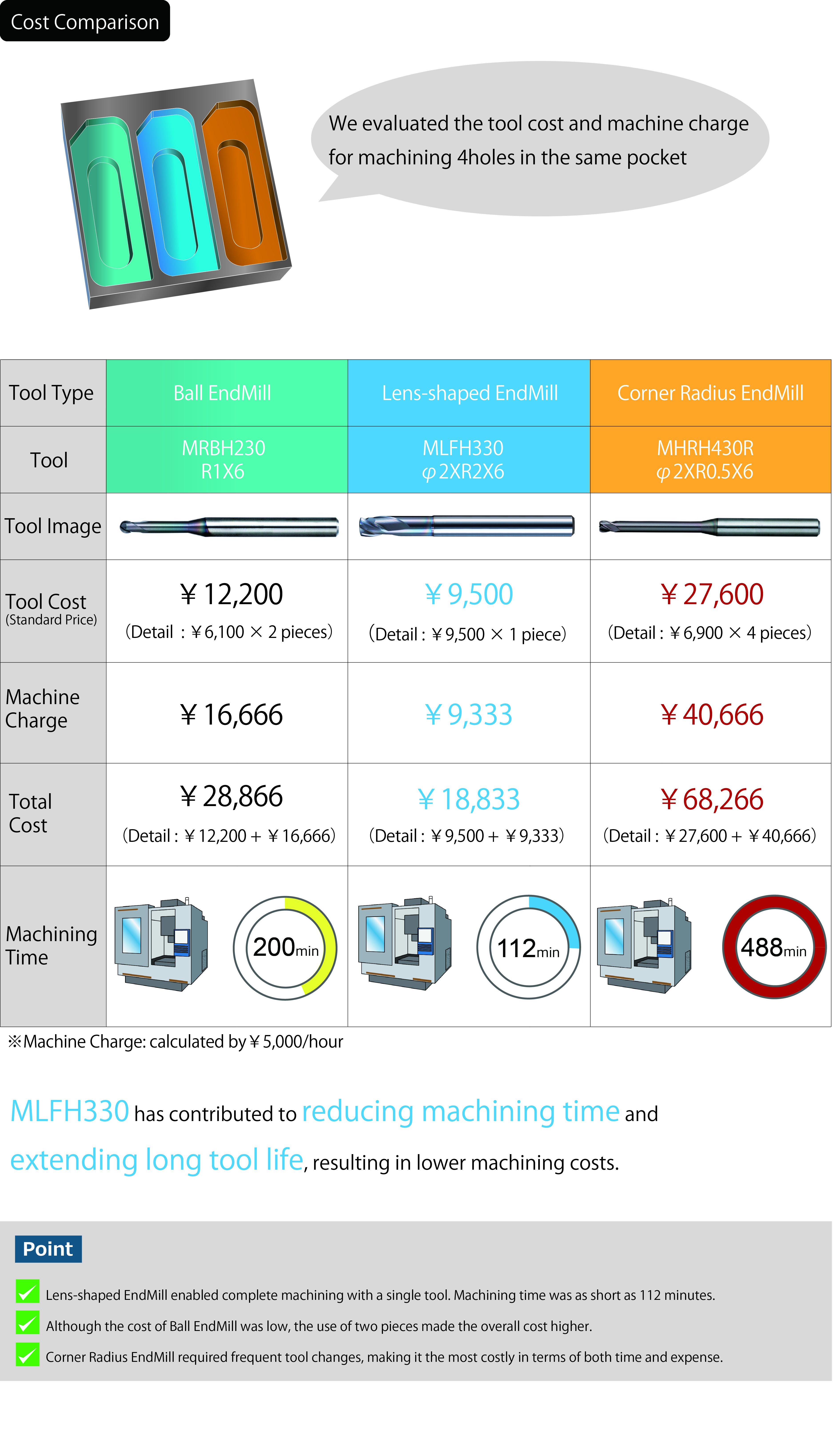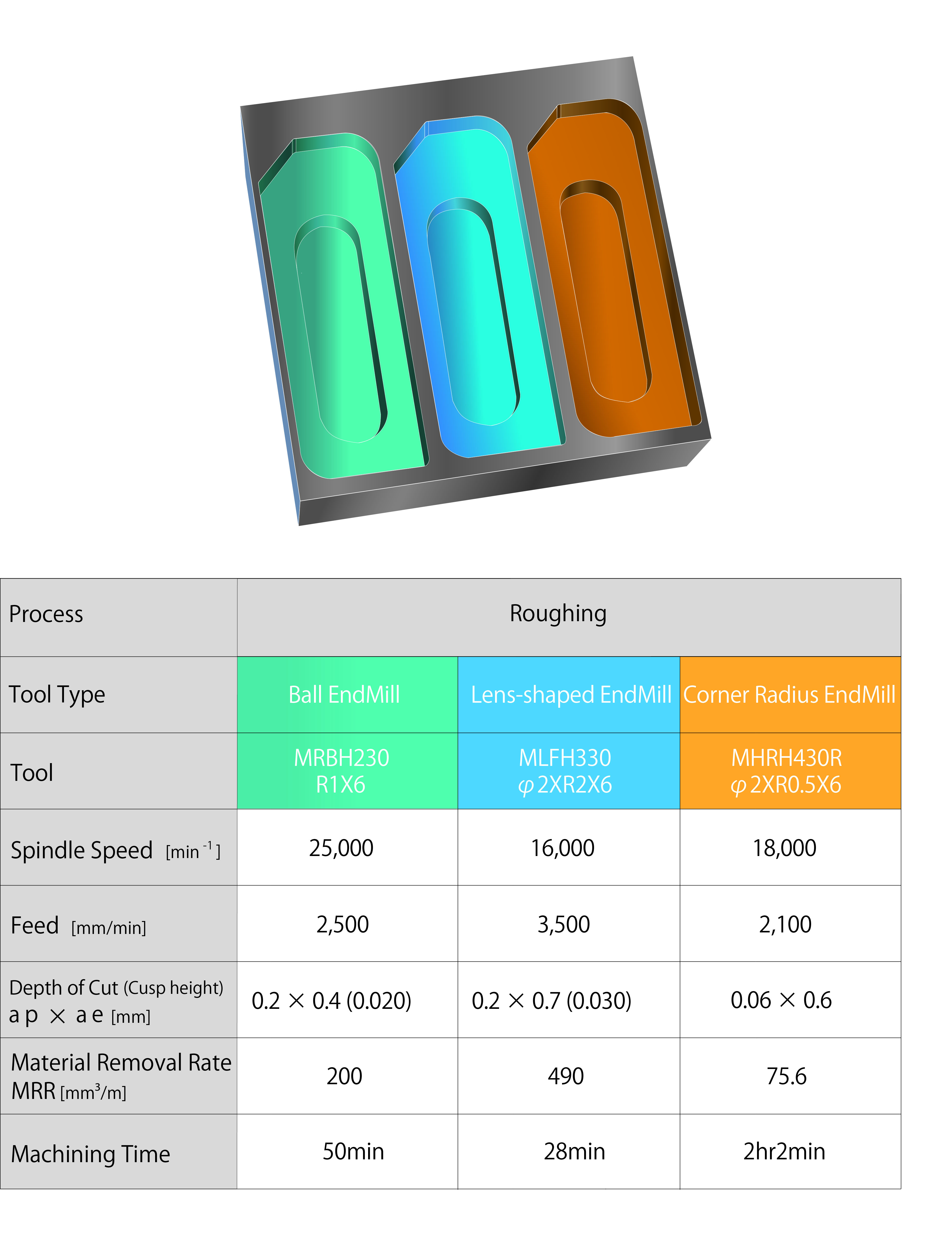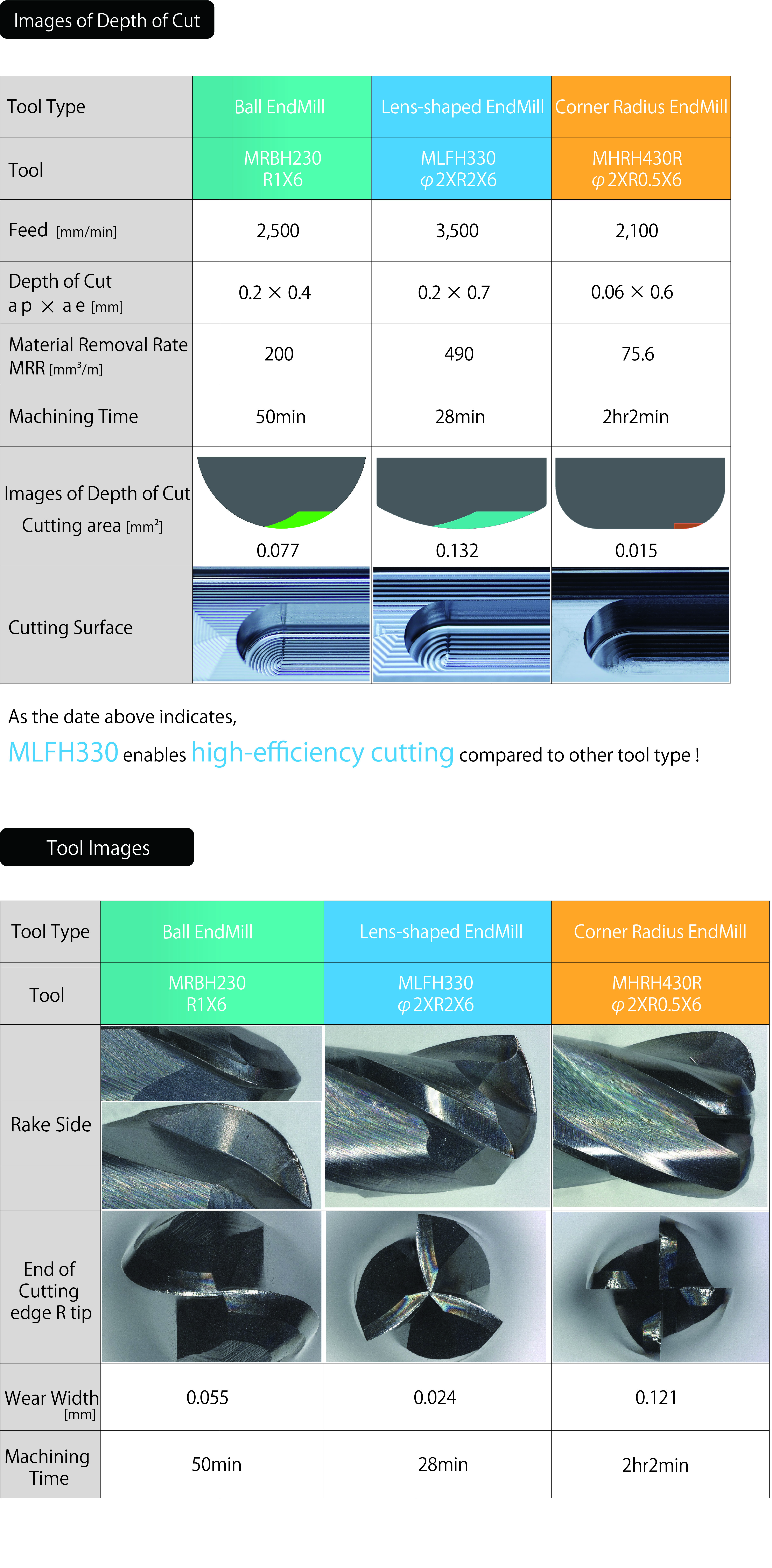 ●3-flute lens form combines larger pick feed than ball end mills improve machining efficiency.